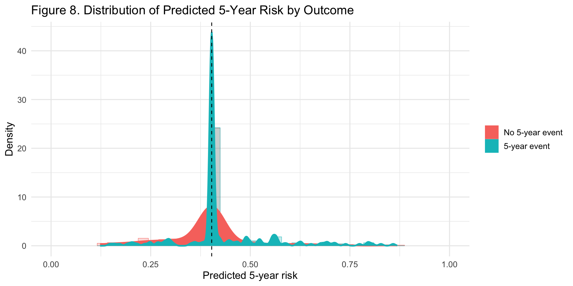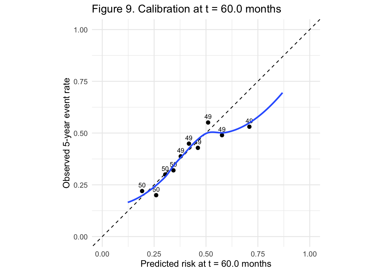 Calibration analyses revealed slight miscalibration. The calibration intercept was -0.13 and the calibration slope was 0.71 (Table 12), deviating from their ideal values of 0 and 1, respectively. The calibration plot (Figure 9) further confirmed that observed 5-year event rates aligned only partially with predicted risks, particularly at the extremes. Consistent with these patterns, the Brier score at 5 years was 0.228 (Table 13), reflecting moderate overall accuracy of probability estimates.
