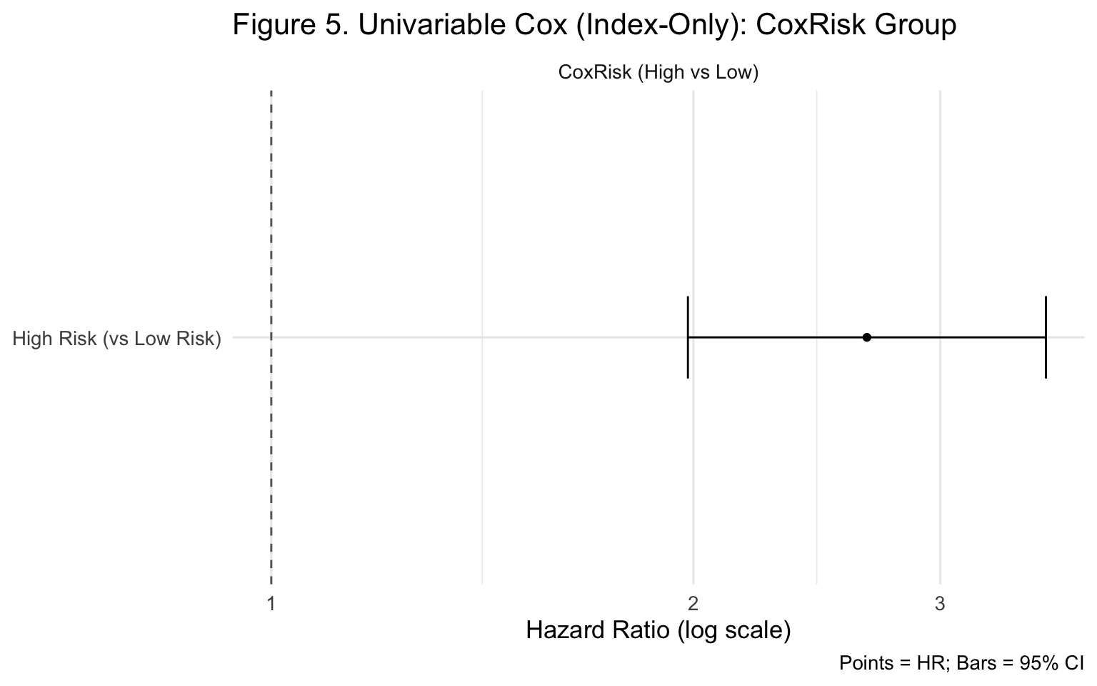 | Table 7. Univariable Cox (Index‑Only): CoxRisk Group | |||||