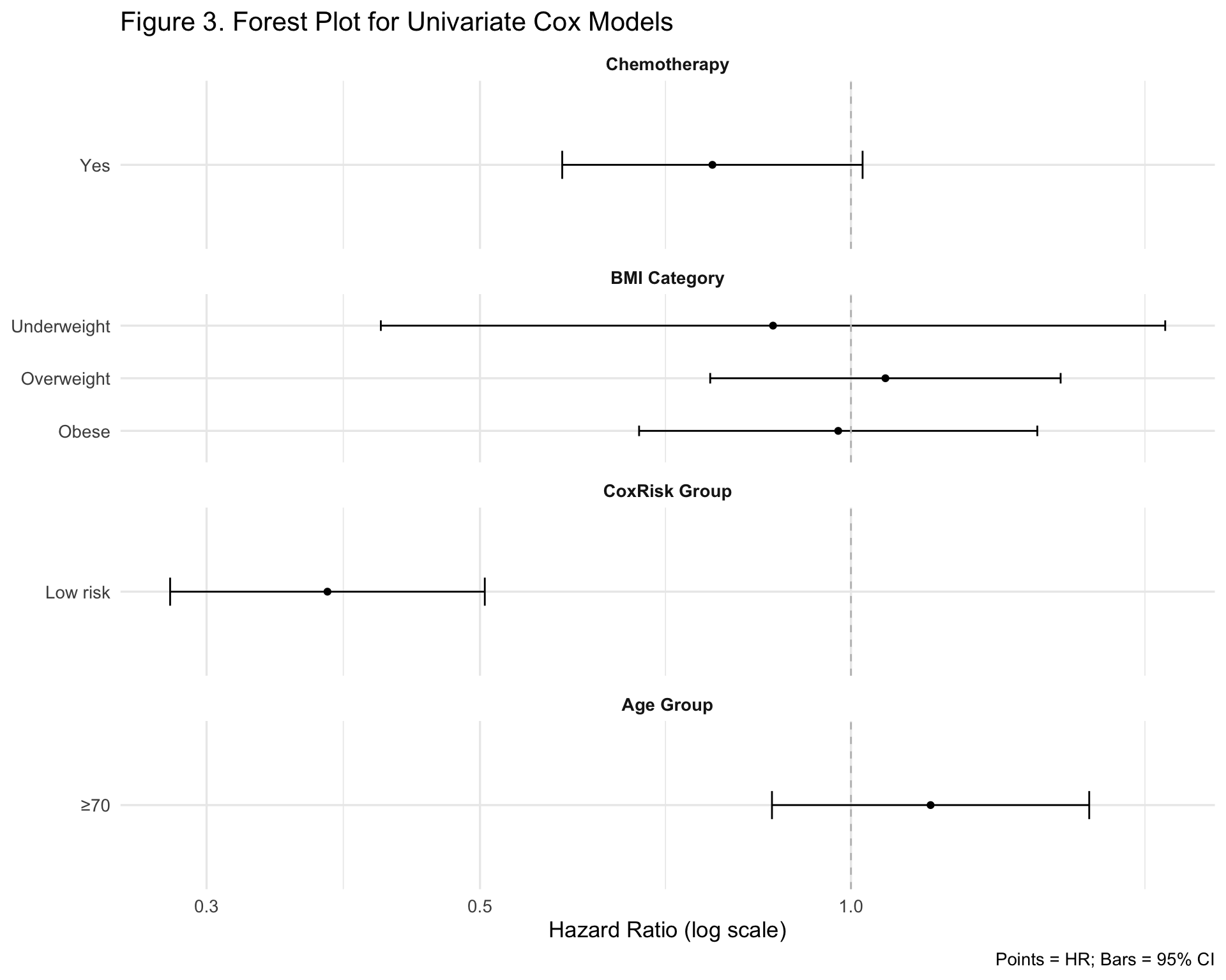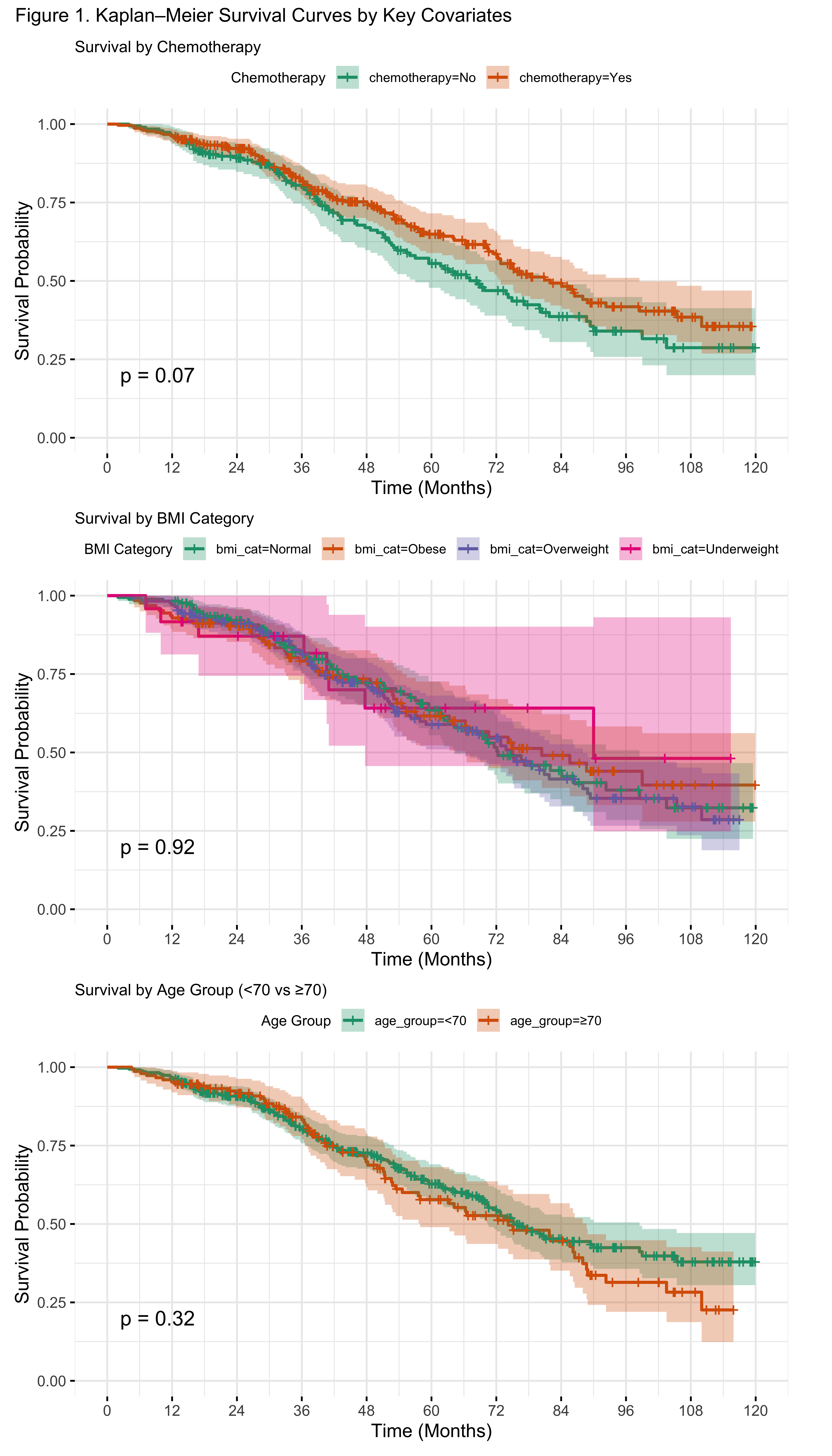 Agewas simulated from a normal distribution (mean = 65, sd = 10) and categorized into groups (<70,≥70).Chemotherapystatus was assigned (“Yes”/“No”) with a 60% prevalence.BMI_catwas generated from categories (“Underweight”, “Normal”, “Overweight”, “Obese”) with prespecified probabilities.Diag_year(2005-2021) was simulated and later categorized to reflect potential era-based treatment differences.