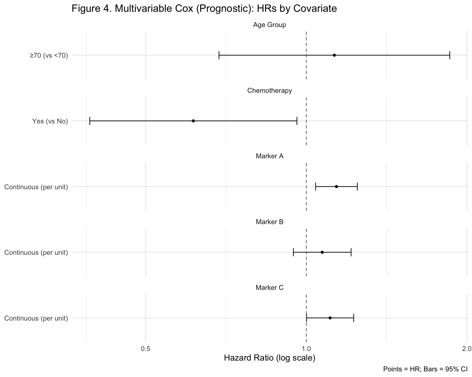 The rationale for this work is to provide an end-to-end pipeline that mirrors the workflow of a real-world IVD validation study in oncology. While the dataset is simulated, the structure reflects the complexities of actual biomarker studies: pre-analytical variability, measurement error, missingness, survival outcomes, and the need for reproducible model evaluation. By constructing a Cox-based composite risk index and evaluating it with complementary metrics—discrimination, calibration, diagnostic accuracy, and laboratory precision—this project showcases how statistical programming, survival modeling, and reproducibility practices can be integrated into a rigorous, publication-ready report. The approach emphasizes clarity, interpretability, and methodological breadth, serving both as a portfolio artifact and as a teaching template for IVD-style prognostic modeling.