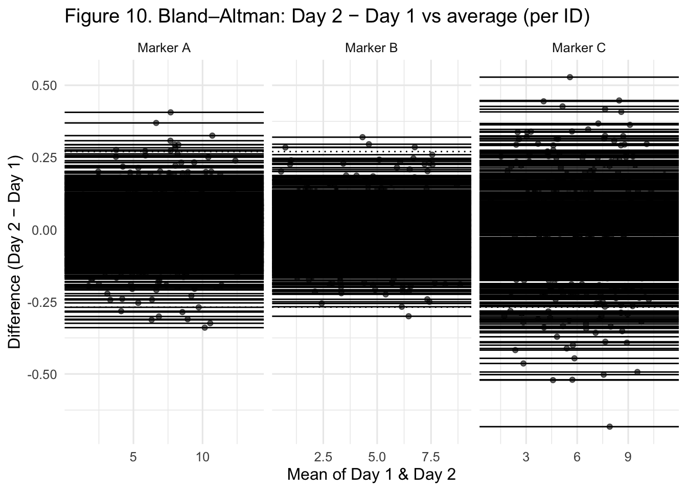 Agreement between Day 1 and Day 2 was close to unbiased across markers. For Marker A, the mean difference (Day 2 − Day 1) was 0.01 with 95% LoA [-0.23, 0.24] (n = 494). For Marker B, the mean difference was 0.00 with 95% LoA [-0.20, 0.21] (n = 494). For Marker C, the mean difference was -0.00 with 95% LoA [-0.35, 0.34] (n = 494). Across panels, mean differences hover near zero and LoA are narrow relative to each assay’s measurement range, indicating good repeatability between days.