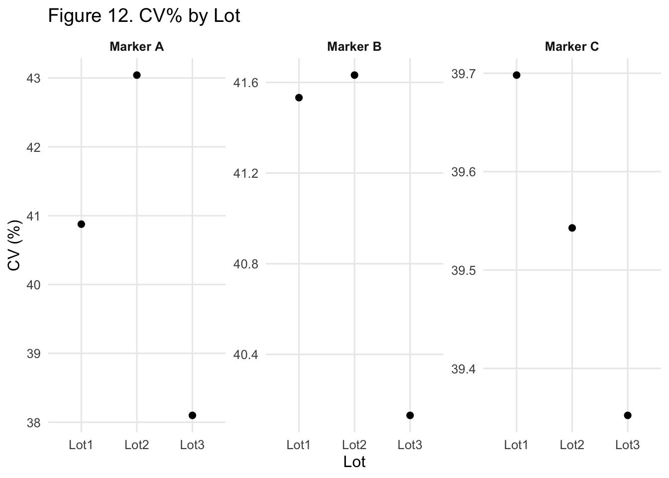 Lot‑to‑lot variability was limited and comparable to site‑level spread. CV% ranges by marker: Marker A 38.1–43.0%, Marker B 40.1–41.6%, Marker C 39.4–39.7%. Median CV% by lot: A 40.9%, B 41.5%, C 39.5%.