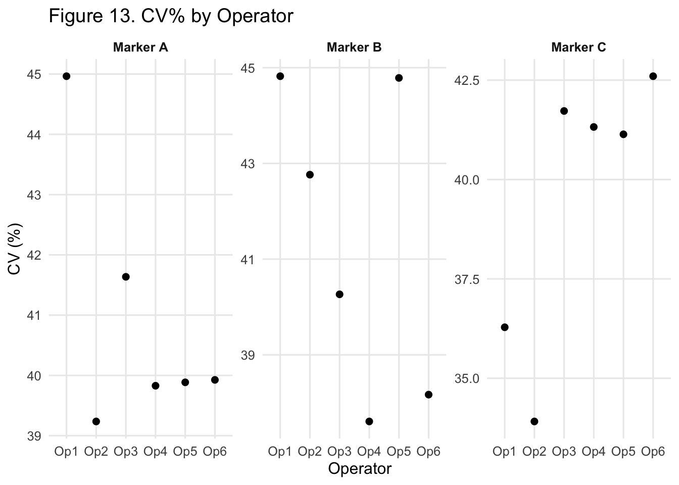 Operator‑level precision showed modest spread with no extreme outliers. CV% ranges by marker: Marker A 39.2–45.0%, Marker B 37.6–44.8%, Marker C 33.9–42.6%. Median CV% by operator: A 39.9%, B 41.5%, C 41.2%.