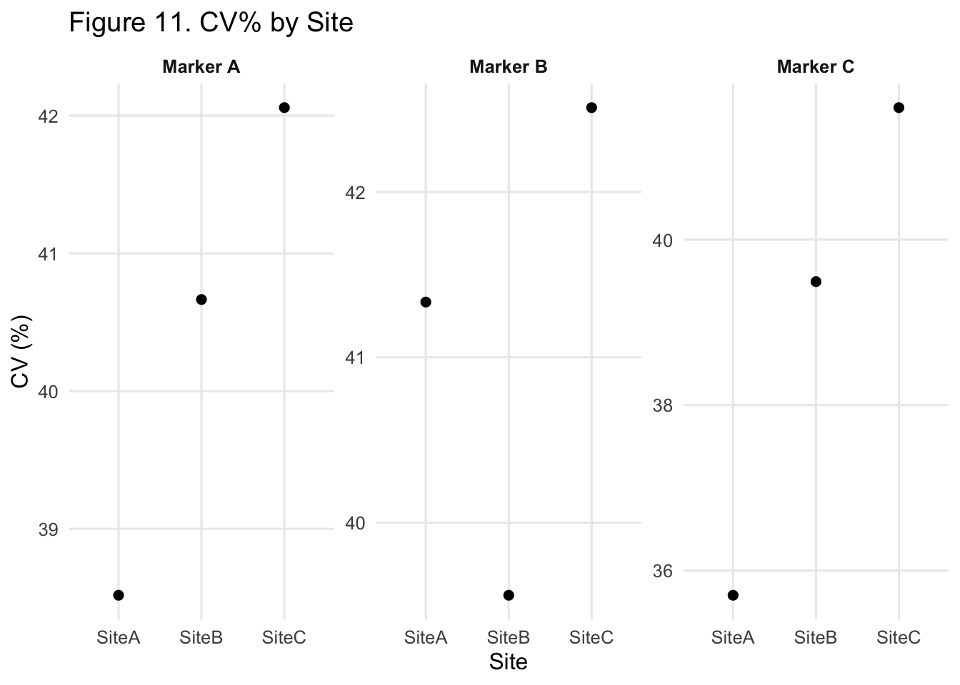 Across sites, precision was broadly similar. Estimated CV% ranges (min–max) by marker were: Marker A 38.5–42.1%, Marker B 39.6–42.5%, and Marker C 35.7–41.6%. Median CV% across sites: A 40.7%, B 41.3%, C 39.5%.