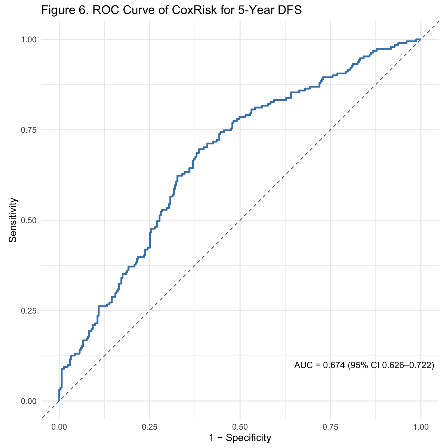 The continuous CoxRisk score showed an AUC of 0.674 (95% CI 0.626–0.722), indicating moderate discrimination for 5‑year DFS. At the pre‑specified median cutoff (High ≥ median), the operating point on the ROC curve corresponded to a sensitivity of 68.6% (95% CI 61.5%–75.1%) and a specificity of 61.7% (95% CI 56%–67.2%), consistent with the diagnostic table.