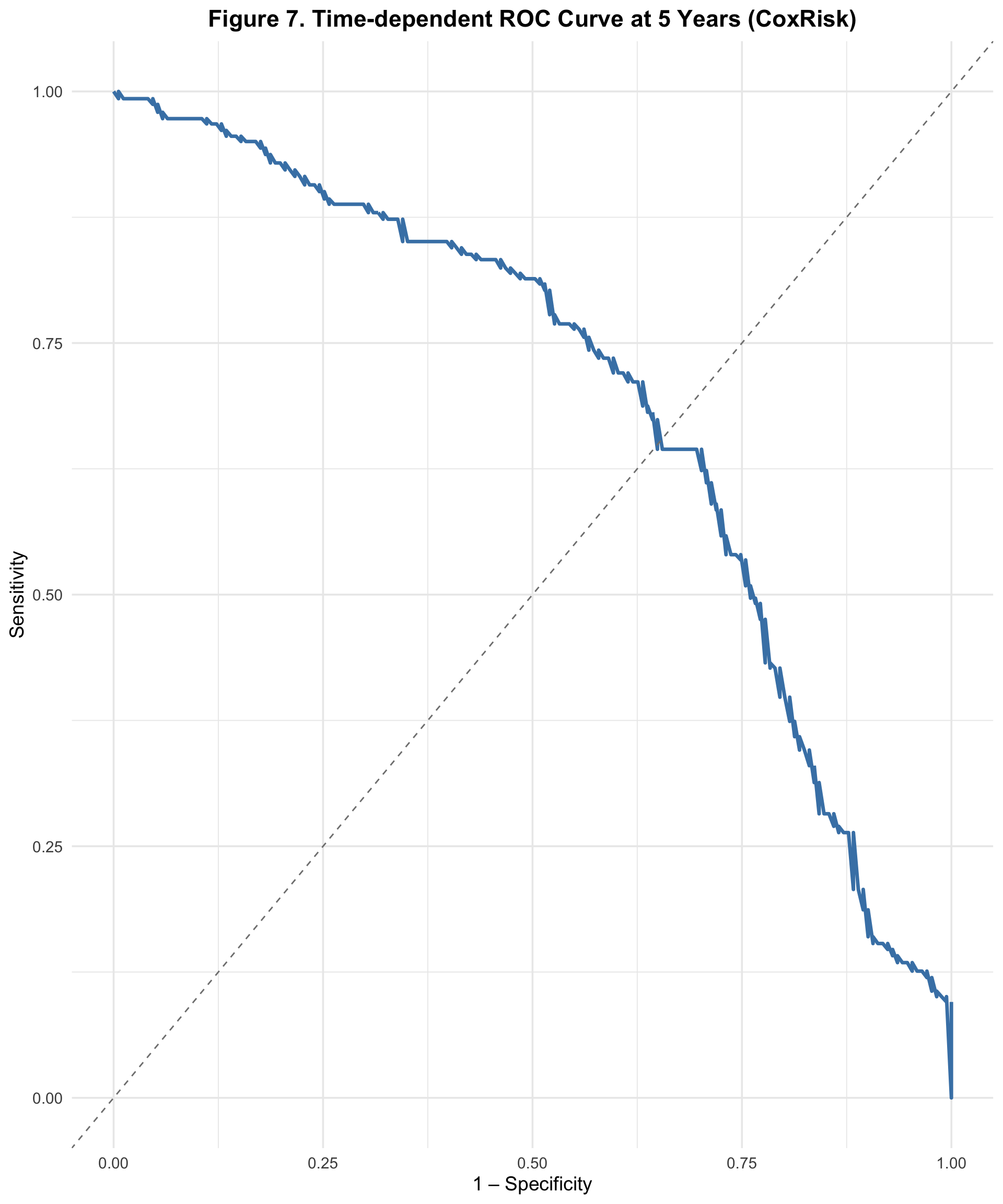 In this simulated cohort of 494 patients, we evaluated the prognostic and diagnostic performance of the Cox-based risk index at 5 years. The multivariable prognostic model achieved a C-index of 0.643 (Table 11), while the index-only model yielded a C-index of 0.623 (Table 9). Discrimination at 5 years was modest, with an AUC of 0.592 (95% CI 0.546–0.637; Figure 8). Predicted risks were tightly clustered around the median (40.3%; Figure 7), limiting separation across individuals and contributing to the narrow spread of survival curves by quartiles (Figure 6).